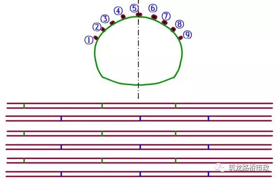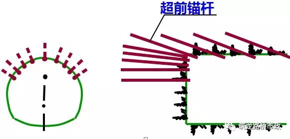 1.构造组成:沿开挖轮廓线,以外插角向前方安装锚杆,形成预锚固;在围岩锚固圈保护下开挖。