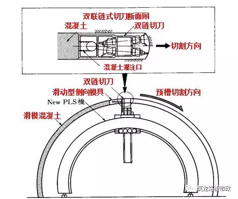 预切槽技术是在开挖工作面之前,用特制的链式机械切刀沿隧道断面周边连续切割出一条厚约数十厘米深数米的窄槽,同时应用和切刀一体化的混凝土灌注设备注入混凝土,从而形成一个连续的起预先支护作用的混凝土壳体。然后在该混凝土壳体的支护下进行工作面机械挖掘。该技术兼备超前预支护以控制地层的变形和提供施工支护及永久支护的功能。