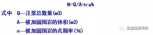 ●现代注浆技术都是采用定压和定量相结合的方法,也就是注浆的数量基本是固定的。这个数量按浆液需填充的孔隙数量选定,而且常以被处理围岩总体积的百分比数表示。
