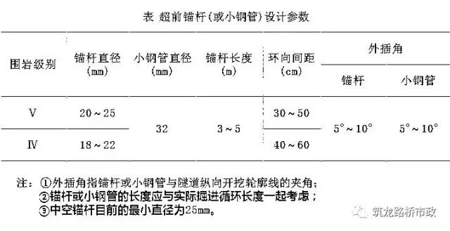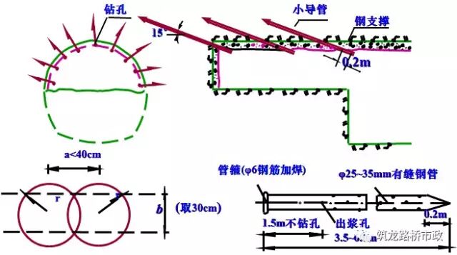 3.设计及施工要点:超前长度:循环进尺的3~5倍,宜3~5m;环向间距:3~5m;外插角:10~30度;搭接长度:超前长度的40%~60%。