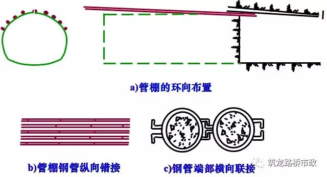 1.构造组成:利用钢拱架,沿开挖轮廓线,以较小外插角向前方打入钢管或钢插板;形成棚架,对前方围岩进行预支护;在管棚预支护保护下开挖。
